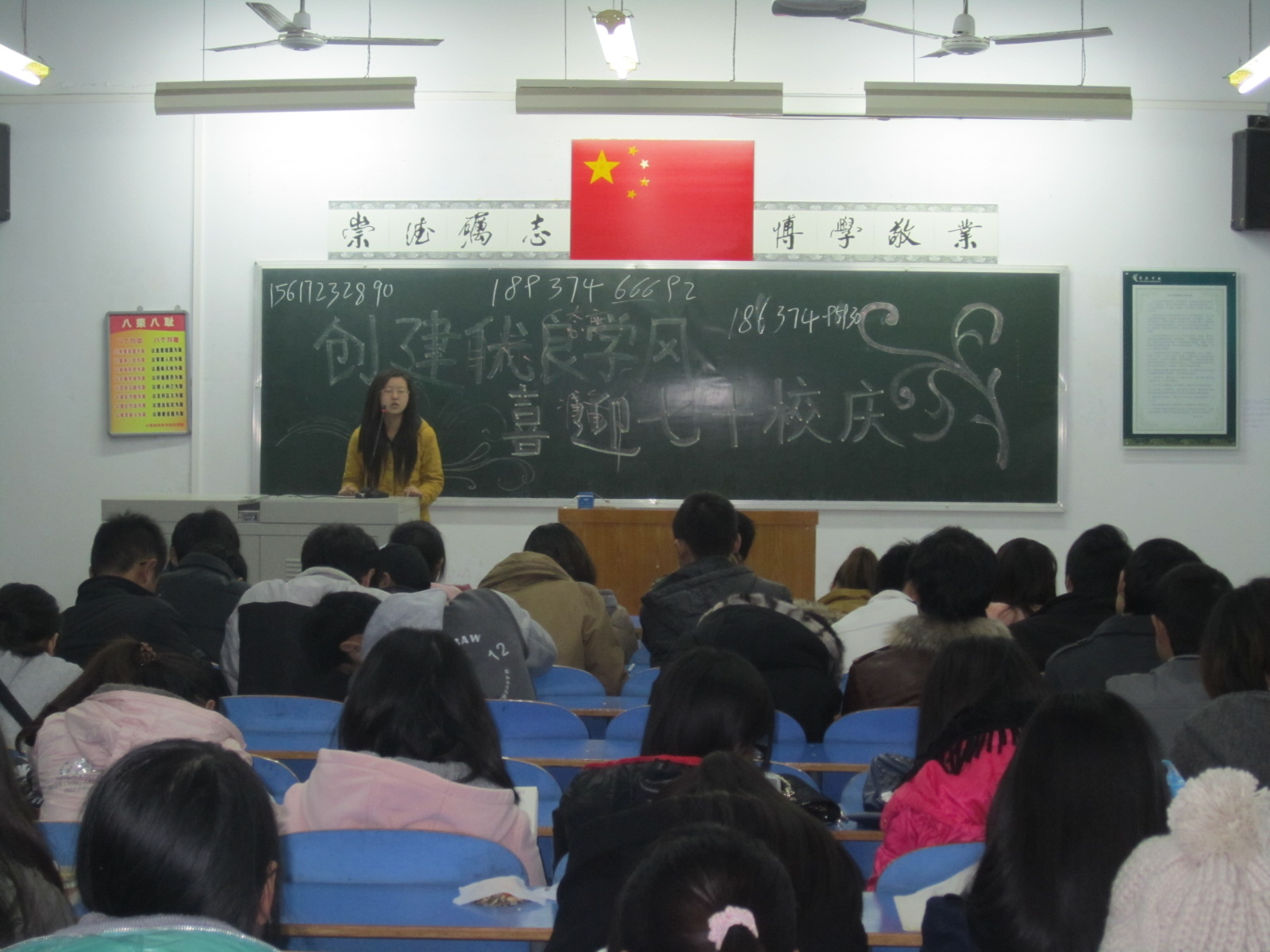 晚上七点,班会开始。首先,在各班团总支的积极组织和班长的配合下,大家纷纷表达了自己对母校英国上市365的深深祝福,并以自己特有的方式展示着自己的风采,向母校英国上市365七十周年华诞献礼。接着,针对自己专业的特性,大三、大二的同学作为学长、学姐向大一的学弟、学妹们分别介绍了自己在学习和生活方面的经验和方法。在401教室,是数字媒体技术专业的同学,班会开始,员工会主席裴新华便从校庆期间,我们该为公司做的贡献做了建议。然后,连续两年国家励志奖学金的大三同学谢丽丽作为员工代表,从学习方法和规划时间方面做了仔细的介绍,并提出自己的建议。接着,10级黄华同学以如何实现自己的目标为题做了演讲。在座的同学均获益匪浅。晚上九点,班会陆续结束。