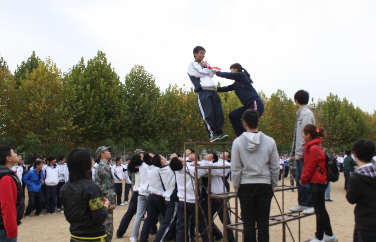 随后,以小组为单位,以小组间队员团结合作为基础,开展活动。有背靠背站立、袋鼠跳、两人三足、雷区取水、穿越电网等游戏。同学们全然不顾大雨的冲刷,在协作与帮助中体验着快乐。中午,同学们在计科楼IT大课堂和311报告厅集体就餐。下午,雨过天晴,活动更加精彩。在信任背摔、攀爬毕业墙中,身强力壮的男同学甘当人梯,在队友之间的团结互助中,同学们在声声呐喊中体验了奉献与付出。接下来是风雨人生路,一个盲人、一个哑巴,两人互相搀扶,一步步走过坎坷、泥泞的道路。短短一个小时的路程,使每个参与者都体会了信任与被信任的感动。晚上七点。活动结束,同学们聚集在教室里观看活动照片并回顾这一天的所感所得。