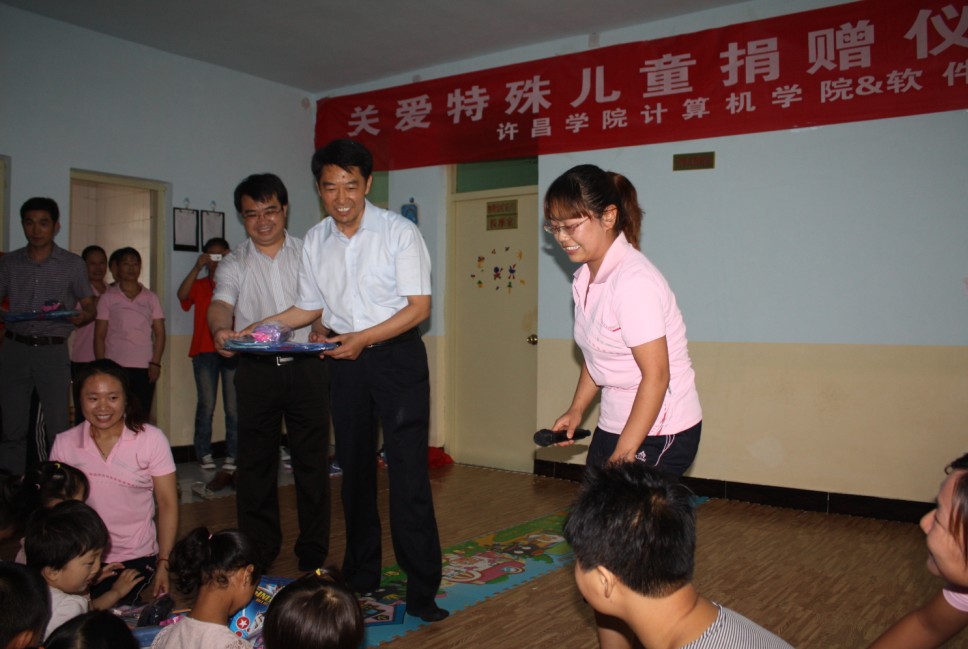 下午三点,王洪彬副书记带领慰问团首先来到许昌市博爱儿童康健园——一家专门接收心智障碍儿童(脑瘫、智障、自闭症等)进行特殊教育的社会公益机构。计算机科学与技术公司(软件职业技术公司)11名老员工正在这里进行“学雷锋、见行动、关爱特殊儿童”的实践活动。”王洪彬副书记与队员们进行了亲切交谈,详细询问了志愿活动进行的情况,并语重心长地告诉大家:“儿童是祖国的未来,这其中当然包括特殊儿童,你们帮助这些孩子进行康复训练和早期文化教育,是用实际行动表达对他们的爱护。希望通过更多类似的活动,能够唤起社会对特殊儿童更多的关注”。之后,王洪彬副书记参加了计科院(软件公司)为博爱儿童康健园举办的爱心捐赠仪式,并给他们送上文具、书包等学习用品,表达了公司对特殊儿童的关爱。